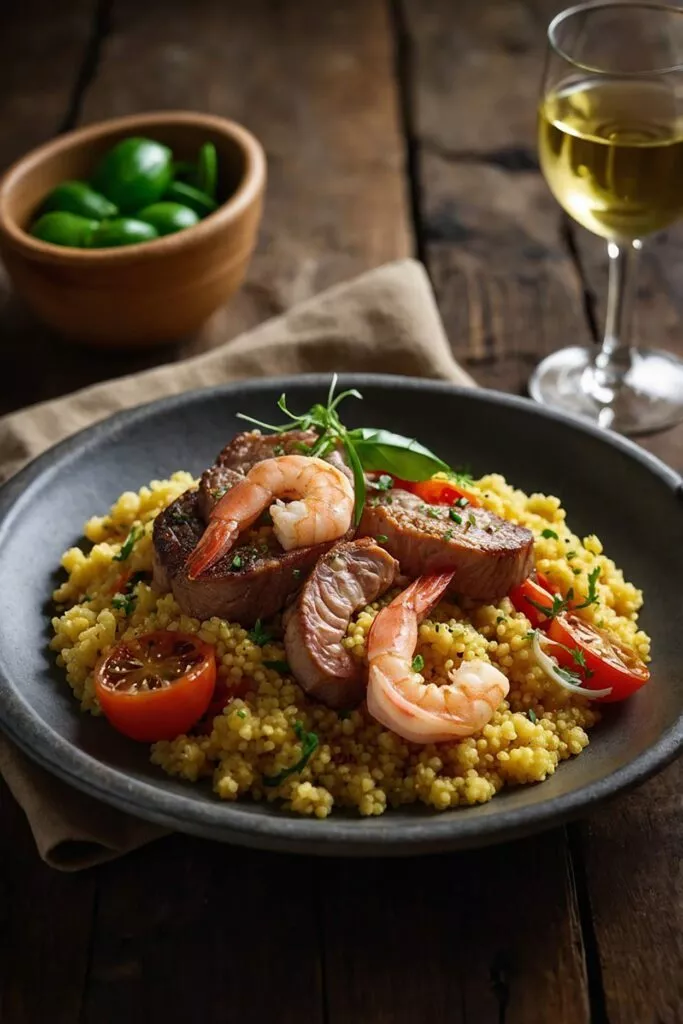 Die Couscous Surf and Turf ist eine perfekte Symbiose aus mediterraner Leichtigkeit und edler Raffinesse. Dieses Gericht vereint zartes...