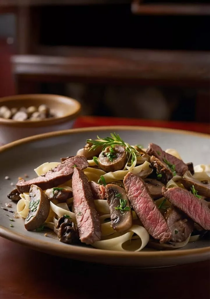 Tagliatelle mit zarten Steakstreifen und duftenden Champignons
