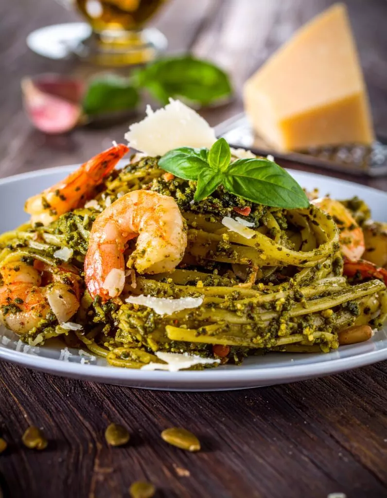 Die verführerische Grill-Pasta mit Garnelen und Basilikum-Pesto