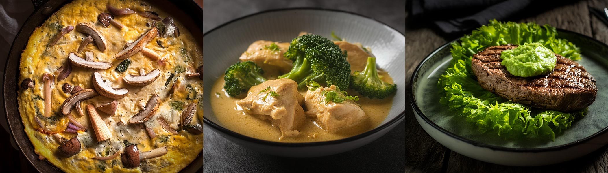 - Hoher Fettanteil: Viele Mahlzeiten enthalten gesunde Fette wie Avocado, Butter, Nüsse, Kokosmilch und Käse.