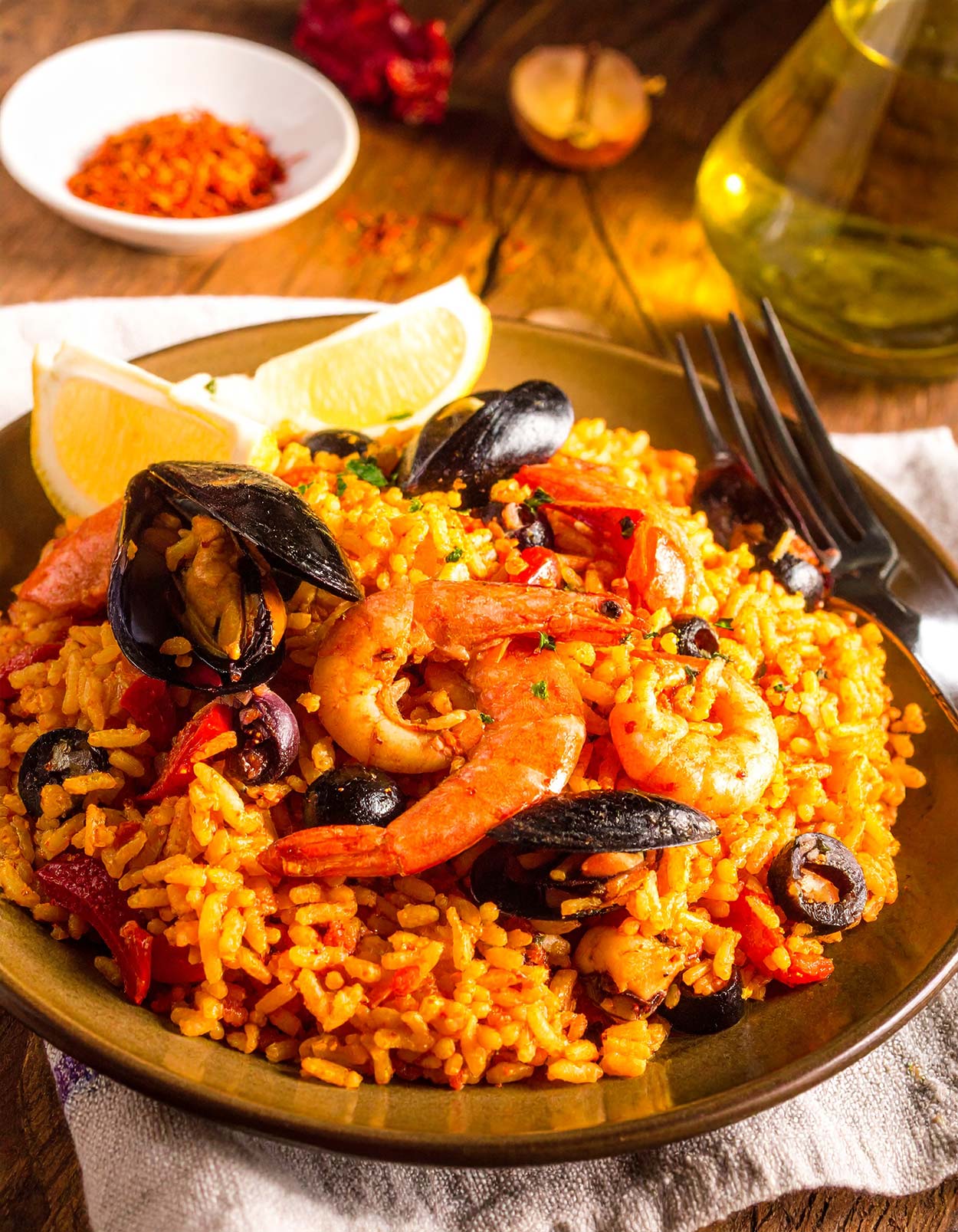 Die Arroz de Marisco ist ein kulinarisches Meisterwerk, das die Sonne Spaniens und die Frische des Meeres auf den Teller zaubert! Jeder Bissen ist eine Explosion von Aromen: zartes Meeresfrüchte-Trio, würziger Safran, fruchtige Tomaten und eine Prise Chili, die dem Gericht eine perfekte Balance zwischen sanfter Süße und feuriger Tiefe verleiht. Der Reis saugt die intensiven Brühen auf und wird cremig-weich, während die Oliven und das frische Zitronenaroma für eine erfrischende Note sorgen. Ein Gericht, das Urlaubsgefühle weckt und jeden Gast begeistert – ob als festliches Menü oder gemütliches Familienessen!