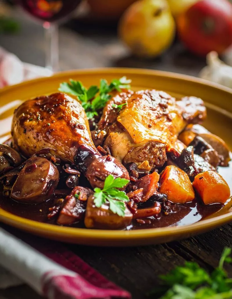 Die perfekte Harmonie aus zartem Hähnchen, würzigem Rotwein und aromatischen Kräutern macht dieses Coq au Vin zu einem unvergesslichen Genuss. Der Duft von langsam geschmortem Fleisch, umhüllt von einer tiefen, samtigen Sauce, verführt schon beim Kochen. Jeder Bissen ist ein Fest für die Sinne: saftig, würzig und voller französischer Lebensart. Ein Gericht, das nicht nur satt, sondern auch glücklich macht – ideal für besondere Anlässe oder gemütliche Abendessen mit Lieblingsmenschen.
