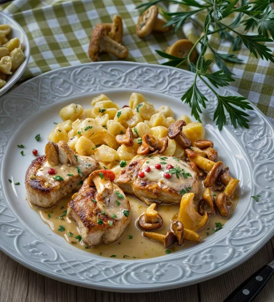 Schweinefilet mit Knöpfle und Pfifferlingen ist ein wahres Meisterwerk der gehobenen Küche und bringt das Beste aus der deutschen Tradition auf den Tisch. Das zarte Schweinefilet, perfekt angebraten in Butterschmalz, ist saftig und voller Geschmack. Die cremige Sauce verfeinert mit Lauch, Knoblauch und Senf, harmoniert wunderbar mit dem Fleisch und sorgt für ein delikates Aroma. Das Paprikapulver verleiht der Sauce eine feine Würze und rundet das Gesamtbild perfekt ab.