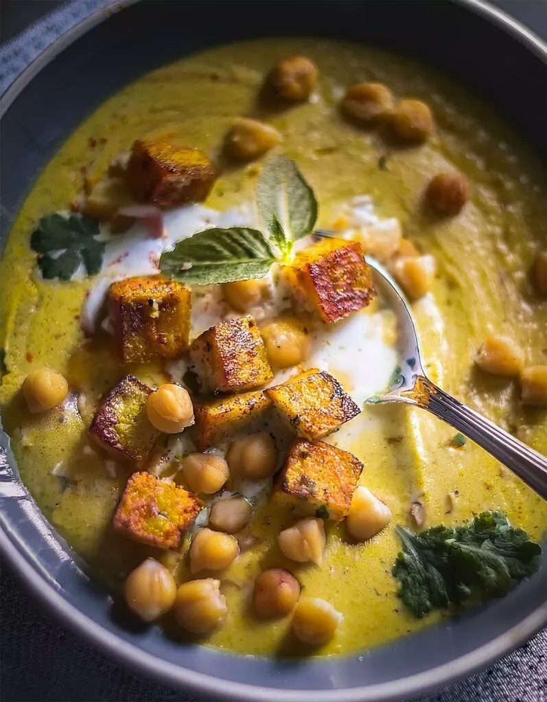 Die Kokos-Kichererbsensuppe mit Gewürztofu ist ein wahrer Genuss für die Sinne. Die samtige Kokosmilch harmoniert perfekt mit den wärmenden Curry-Gewürzen und der leichten Schärfe des Chilis.
