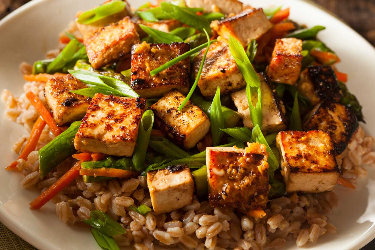 - Reis mit Tofu anrichten. Mit Blättern von 2 Stielen Koriandergrün und Limettenschale bestreuen, mit Limettenspalten servieren.