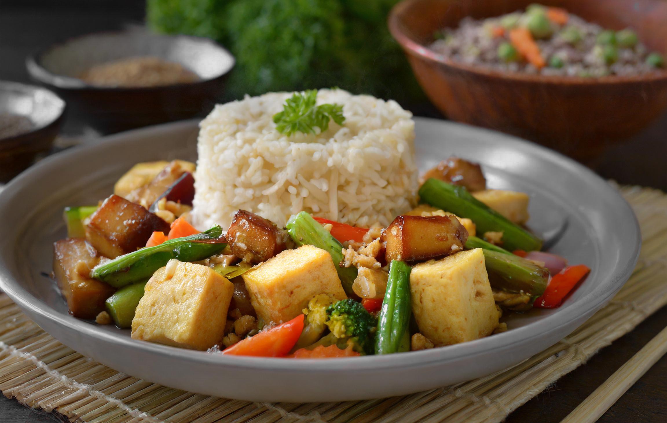 - Tofu Stir Fry mit Sojasauce, Zitronensaft und Chilipulver abschmecken, mit gehacktem Koriander sowie Sesamsamen garnieren und mit dem Reis servieren.