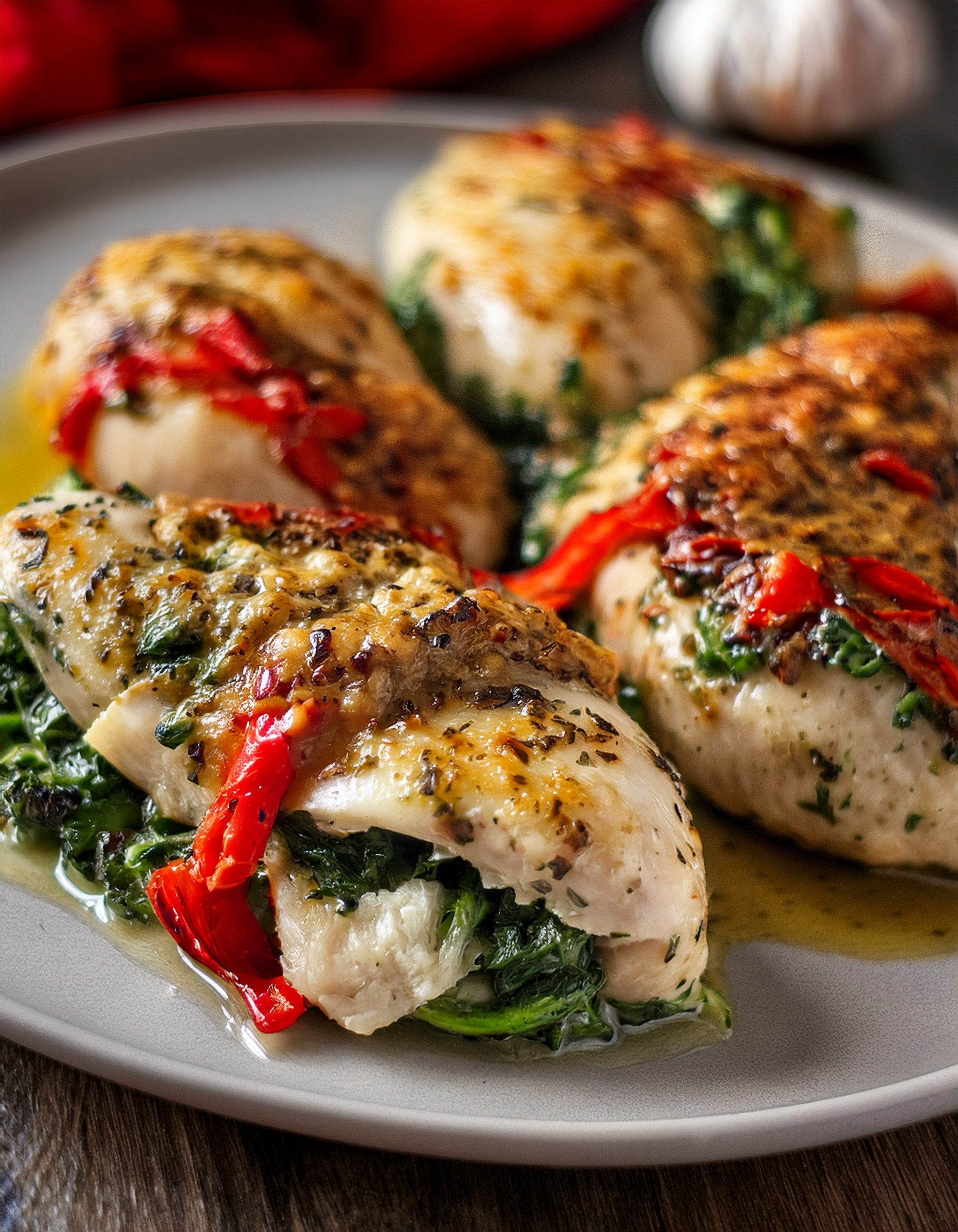 Die gefüllten Hähnchenfilets sind ein absoluter Gaumenschmaus! Zartes Hähnchenfleisch, gefüllt mit einer harmonischen Mischung aus gerösteten Paprika, frischem Spinat und cremigem Mozzarella, vereint sich zu einem Gericht, das nicht nur optisch überzeugt, sondern auch geschmacklich begeistert. Die Kombination aus würzigem Knoblauch, saftigem Hähnchen und der leicht rauchigen Note der Paprika macht jeden Bissen zu einem Erlebnis. Perfekt für besondere Anlässe oder ein gemütliches Abendessen mit Familie und Freunden – dieses Gericht wird garantiert zum Highlight auf jedem Tisch!