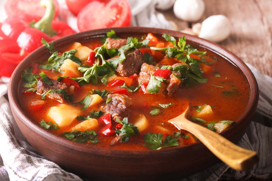 - Das Fleisch mehlieren, 1 EL Öl in einem Topf erhitzen, das Fleisch bei starker Hitze ca. 2 Minuten scharf anbraten, mit Salz und Pfeffer würzen und herausnehmen. Das restliche Öl in den Topf geben. Die Zwiebeln darin bei mittlerer Hitze 3-4 Minuten braten. Tomatenmark und Paprikapulver zugeben, mit Wein und Rinderfond und Tomaten ablöschen und ca. 10 Minuten einkochen.