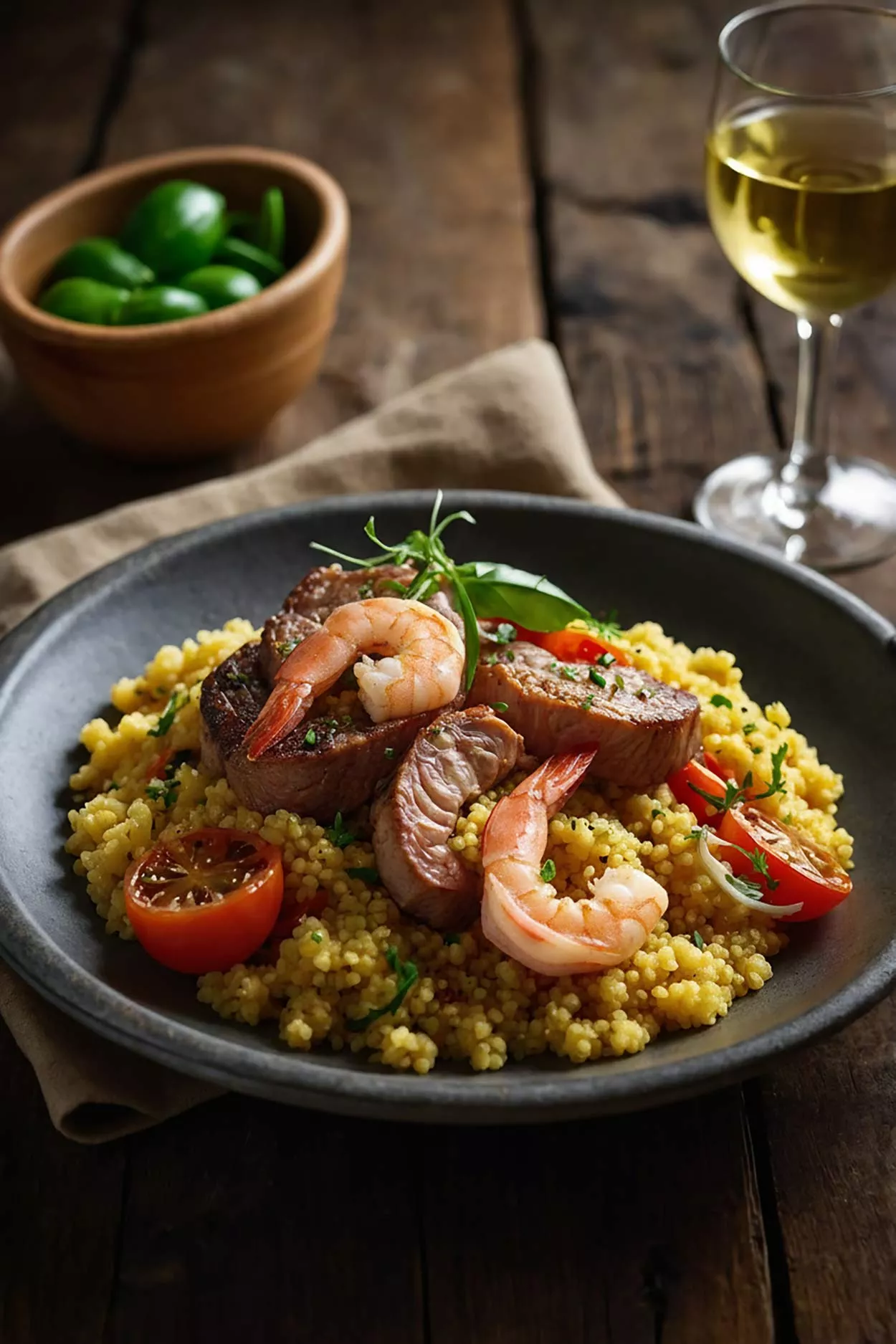 - Vorspeise: Eine leichte Gemüsesuppe oder ein frischer Salat mit Garnelen.