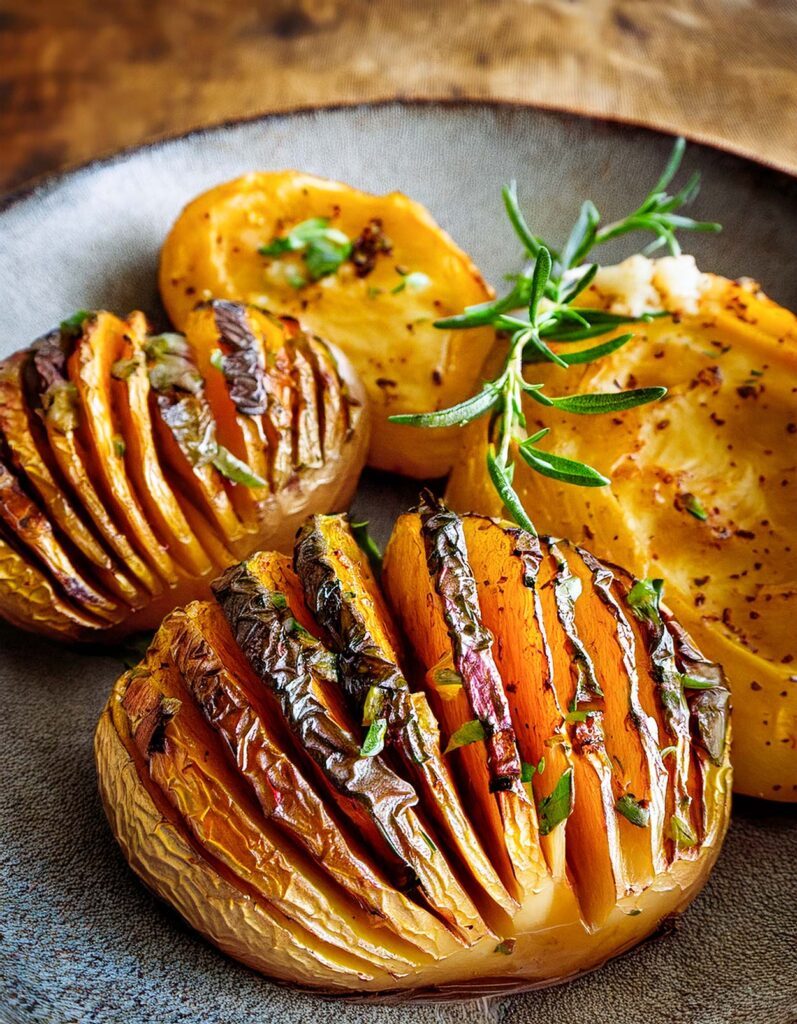Cremiges Kürbispüree mit knusprigen Hasselback-Kartoffeln