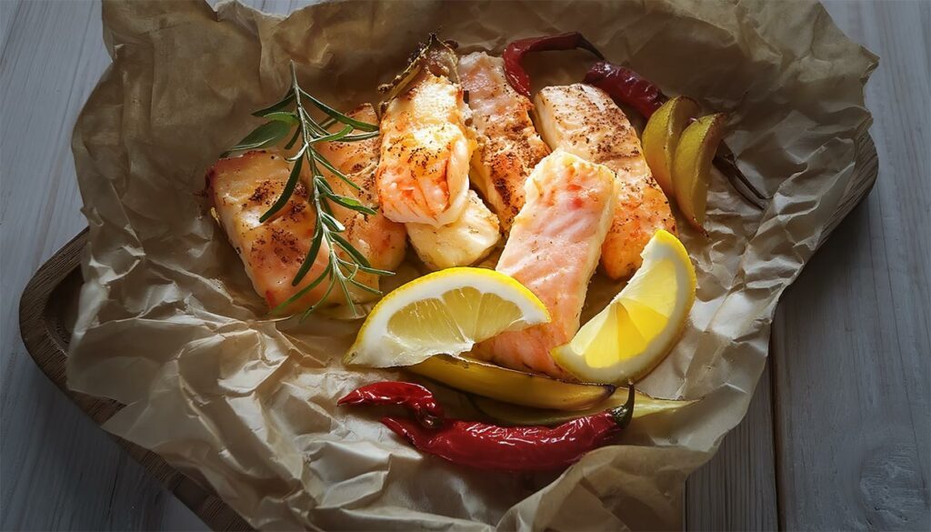 Fischpäckchen vom Grill mit Fischfilet und Scampi