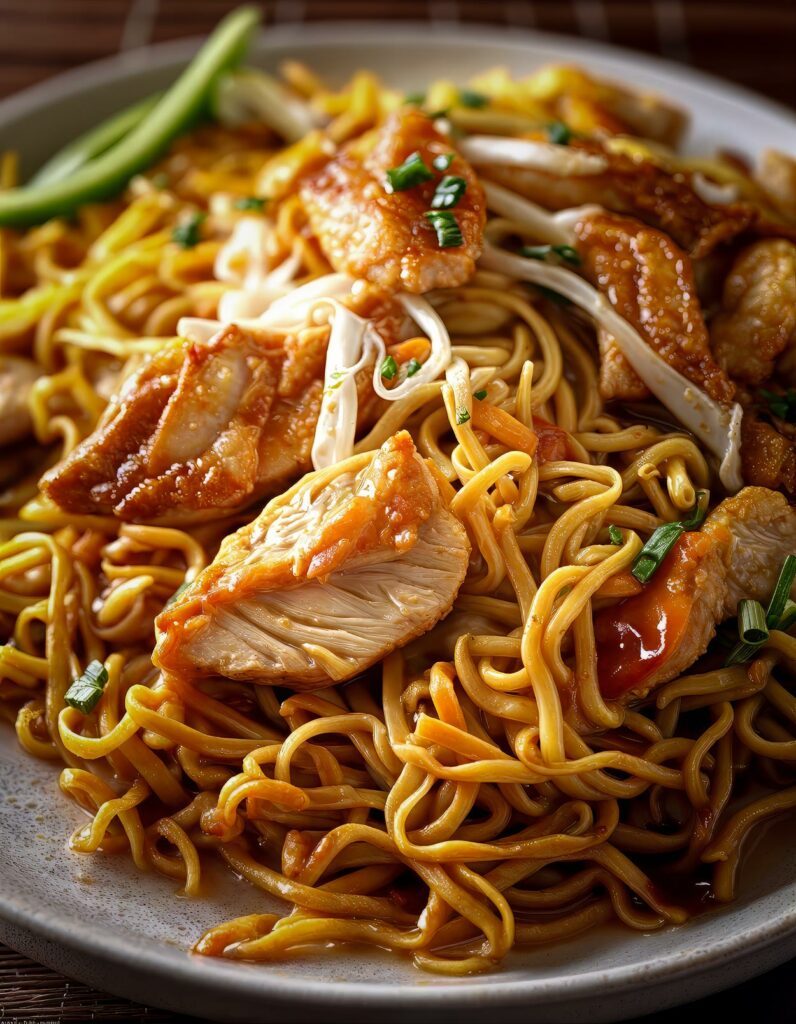 Chinesisch gebratene Nudeln mit Hühnchen ist ein kulinarisches Highlight, das durch seine bunte Vielfalt an Aromen und Texturen begeistert....
