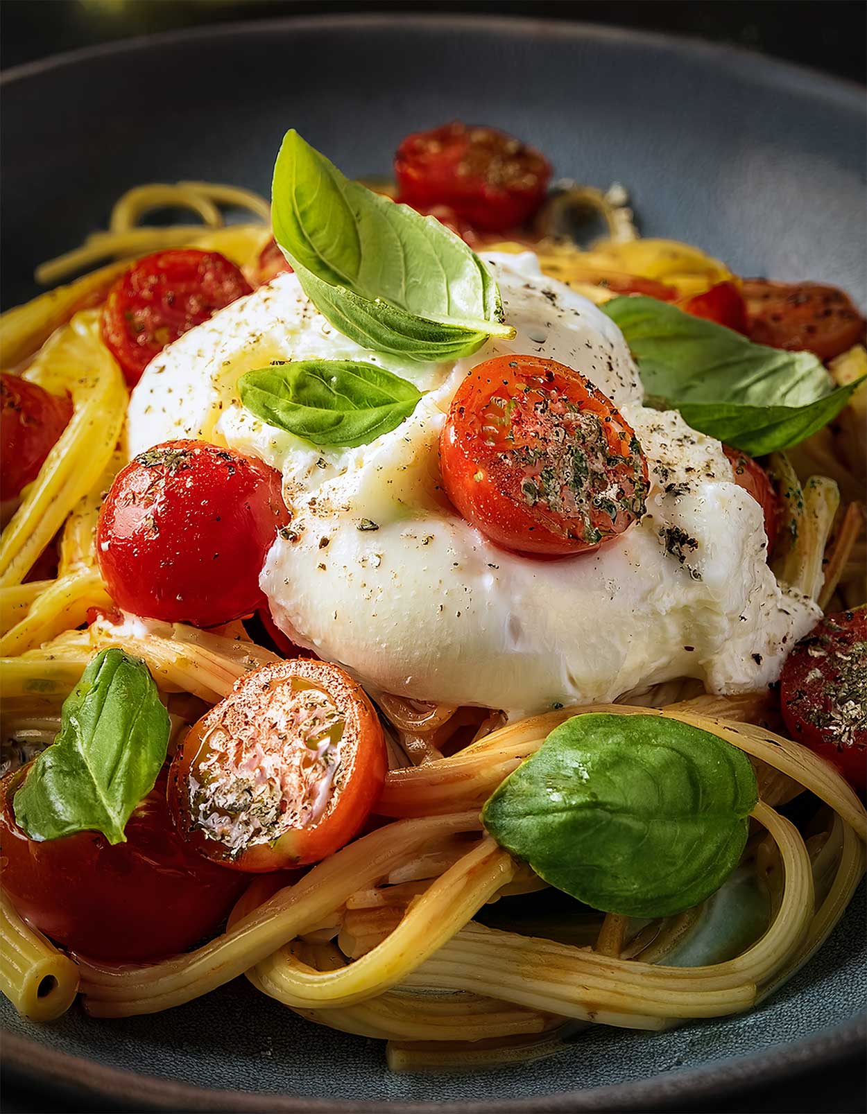 - Nudeln und Tomaten auf 2 Tellern anrichten und mit je einer Kugel Burrata und Basilikum servieren.