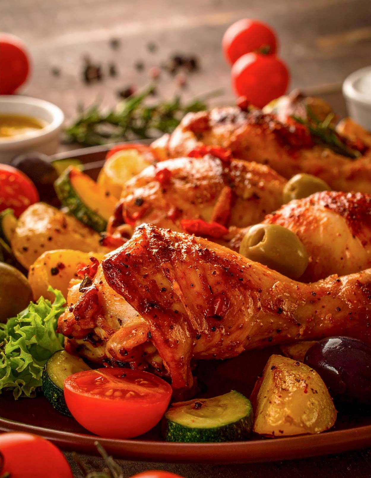 • Gemüse vorbereiten: Kartoffeln, Zucchini, Oliven und Kirschtomaten um die Hähnchenkeulen herum verteilen. Mit Olivenöl beträufeln und mit Salz, Pfeffer und Rosmarinzweigen würzen.